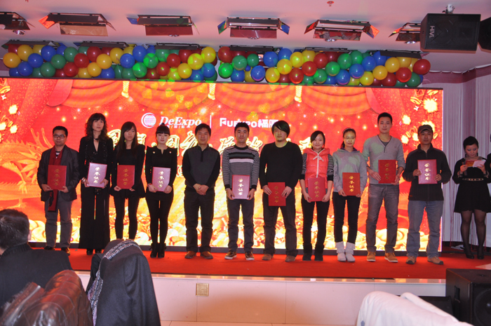 ? ? ?2012年1月14日,德展集團2012迎新年聯歡會在藝宮酒店圓滿閉幕,來自行業協會的領導及供應商等80來人一起見證了德展2011年度的坎坷與輝煌,年會上對員工及供應商的表彰大會彰顯英雄本色,年會上大家積極的節目表演可謂是歡樂與掌聲不斷,年會上的一、二、三及特等將抽獎活動將晚會漸漸帶入高潮。年會在明天會更好的大合唱中結束了,每位員工新年祝福的畫面將成為公司發展的見證及強有力的催化劑,祝大家在新的一年里工作順利!身體健康!