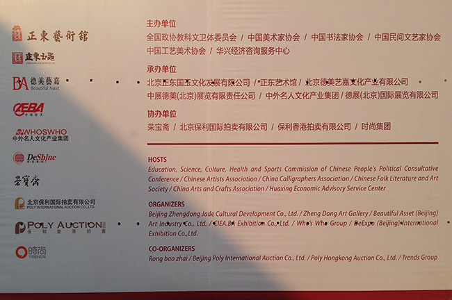 此屆盛會是由全國政協(xié)教科文衛(wèi)體委員會、中國美術(shù)家協(xié)會、中國書法家協(xié)會、中國民間藝術(shù)家協(xié)會、中國工藝美術(shù)協(xié)會、華興經(jīng)濟咨詢服務(wù)中心共同主辦,北京正東國玉文化發(fā)展有限公司、正東藝術(shù)館、北京德美藝嘉文化產(chǎn)業(yè)有限公司、德展(北京)國際展覽有限公司、中展德美展覽有限責(zé)任公司、中外名人文化產(chǎn)業(yè)集團聯(lián)合承辦,榮寶齋、北京保利國際拍賣有限公司、保利香港拍賣有限公司、時尚集團聯(lián)合協(xié)辦。