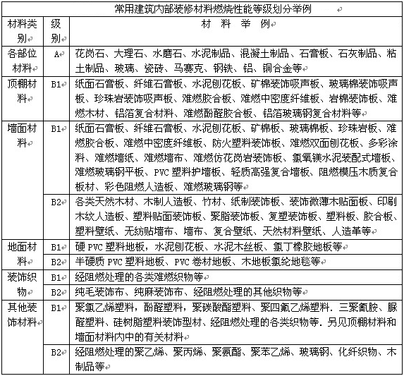 展覽用常用建筑內部裝修材料燃燒性能等級劃分
